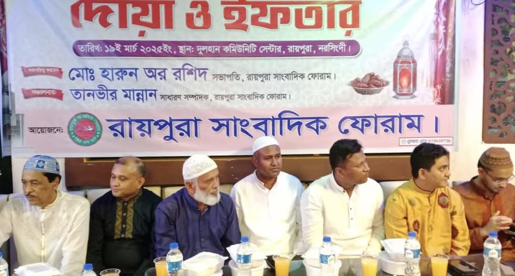 নরসিংদী রায়পুরায়, রায়পুরা সাংবাদিক ফোরামের উদ্যোগে দোয়া ও ইফতার মাহফিল গত ১৯মার্চ বুধবার বিকেলে ক্রাউন ক্যাফ এন্ড পার্টি সেন্টারে অনুষ্ঠিত হয়েছে। সভাপতিত্ব করেন সংগঠনের সভাপতি হারুন অর রশিদ,সাধারণ সম্পাদক তানভীর মান্নানের সঞ্চালনায় , এ সময় বক্তব্য রাখেন রায়পুরা উপজেলা নির্বাহী কর্মকর্তা মো:মাসুদ রানা, সহকারি কমিশনার ভূমি, মো:মাসুদুর রহমান রুবেল, কেন্দ্রীয় নির্বাহী কমিটির সদস্য হাজী ইকবাল হোসেন শ্যামল, নরসিংদী জেলা বিএনপির যুগ্ন আহবায়ক ফাইজুর